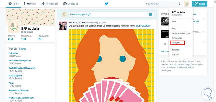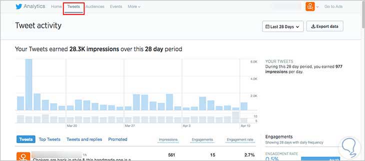 Para saber cuántas interacciones has tenido en Twitter en un período de tiempo determinado, dirígete a Analytics en el menú desplegable que encontrarás al hacer clic en tu avatar en la esquina superior derecha.