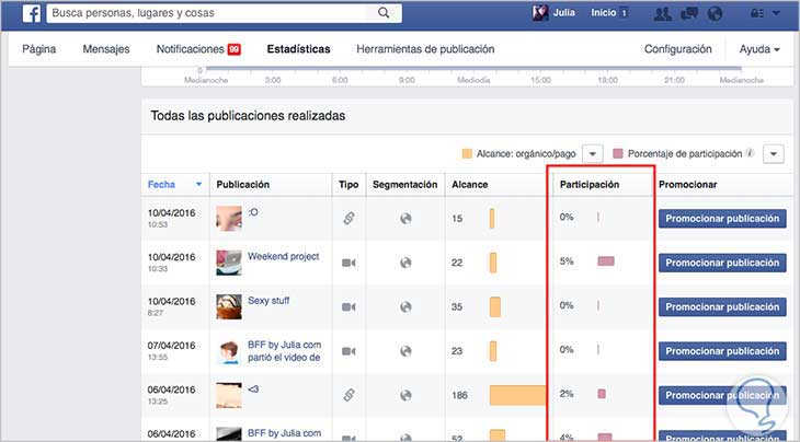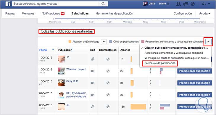 Desplázate hacia abajo hasta encontrar “Todas las publicaciones realizadas”. Haz clic en la segunda flechita, la que aparece a la derecha de “Clics en publicaciones/reacciones, comentarios y veces que se compartió” y selecciona “Porcentaje de participación” en el menú desplegable.