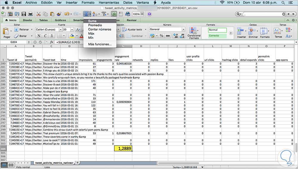 Lo bueno de Twitter es que ya en un solo archivo te da todos los datos (impressions, engagements, engagement rate, retweets, replies, likes, user profile clicks, url clicks, hashtag clicks, detail expands, permalink clicks, etc.), incluyendo la tasa de engagement (engagement rate) sin necesidad de calcularla. Simplemente suma los valores de esa columna, y listo, ya tendrás tu tasa de engagement en Twitter (1,2%).