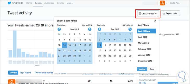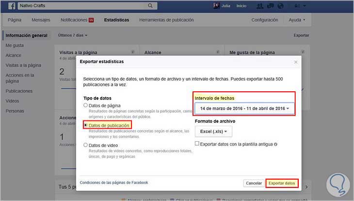 Se abrirá una ventana en donde debes escoger “Datos de publicación”, determinar el intervalo de fechas y hacer clic en “Exportar datos”
