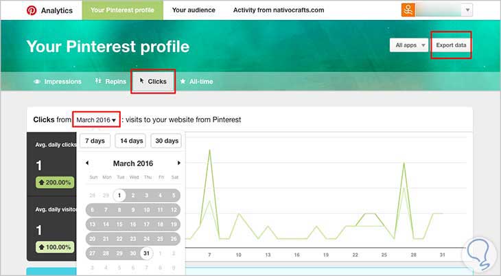 Repite el mismo proceso en la pestaña “Clicks”, escogiendo el mismo rango de fechas que para “Repins” y haciendo clic en “Export Data”