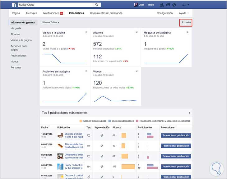 Para obtener los datos de Facebook en un archivo de Excel dirígete a la pestaña de estadísticas y haz clic en “Exportar”, opción que verás en la esquina superior derecha.