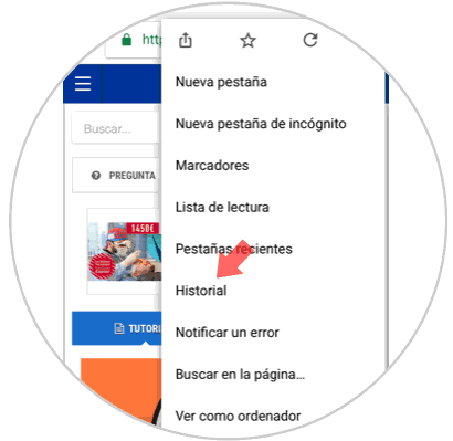 Ahora regresa al menú principal de tu navegador Chrome. Vuelve a pulsar en los tres puntos pero ahora selecciona la opción de Historial.