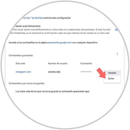 En la ventana que ahora te aparece podrás ver tanto las contraseñas de los sitios web donde tienes guardadas las contraseñas como los que no. Si despliegues el menú lateral de las tres rallitas, vas a ver la opción de quitar esa contraseña.