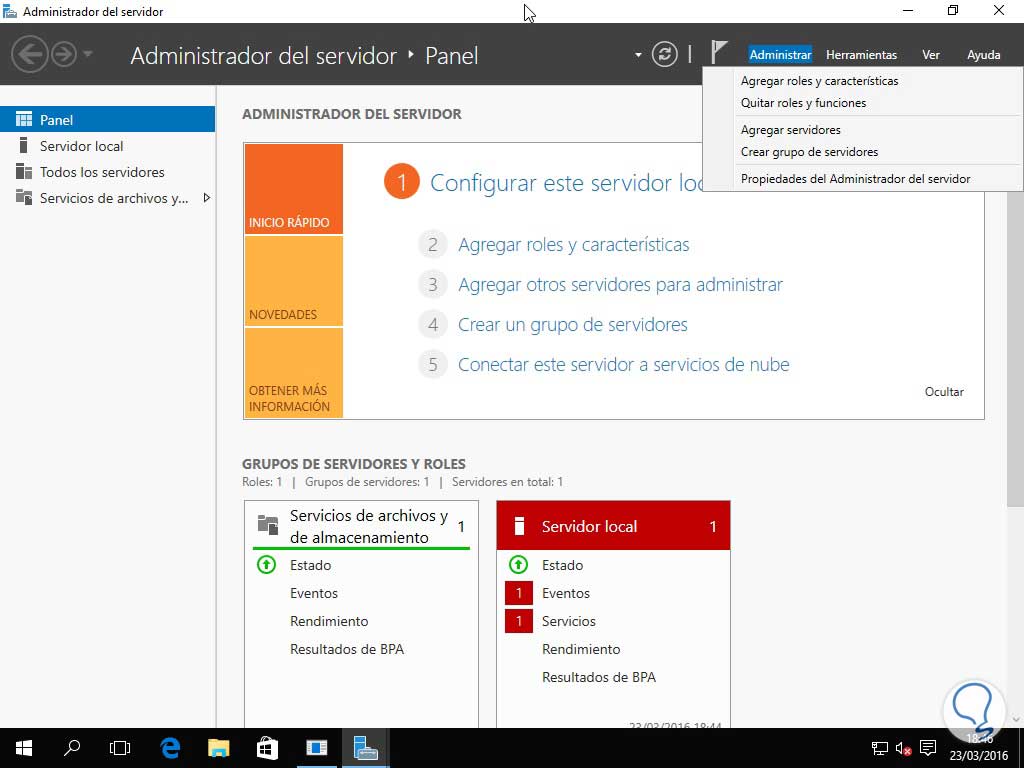 Para ello ingresaremos a nuestro Administrador del servidor y elegiremos la opción Agregar roles y características ubicado en el menú de inicio rápido o en el menú Administrar.