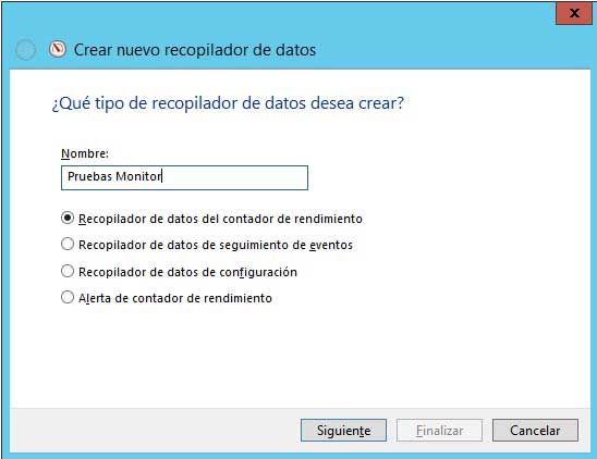 Podremos adicionar contadores de rendimiento de manera personalizada, para ello, debemos dirigirnos al menú Acción, seleccionamos Nuevo y elegimos Recopilador de datos, se desplegará el siguiente asistente en el cual podremos elegir el tipo de contador a ejecutar: