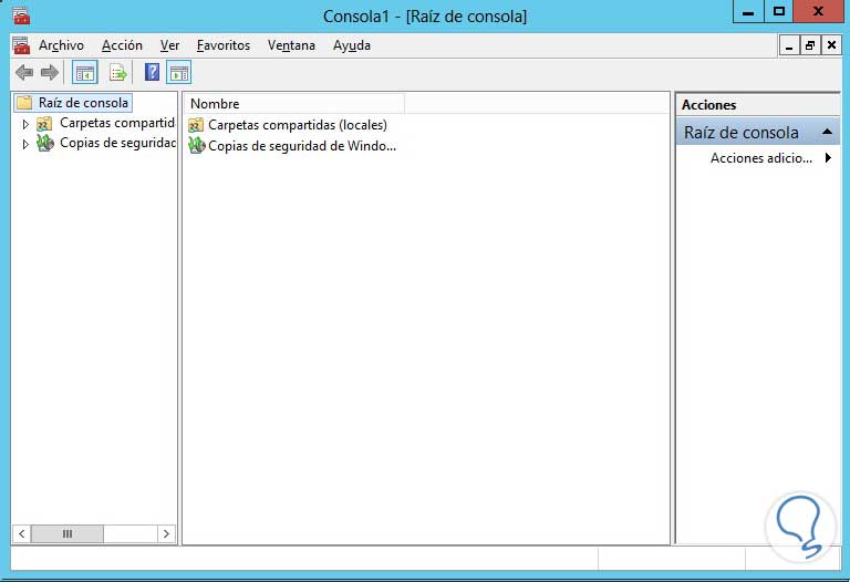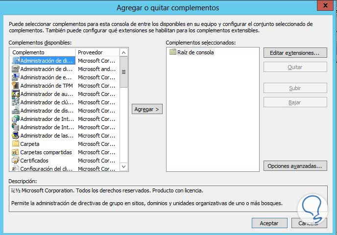 Allí podremos seleccionar los complementos deseados y dar clic en Agregar, finalmente en Aceptar y veremos los complementos que hemos incluido en nuestra ventana principal de MMC.