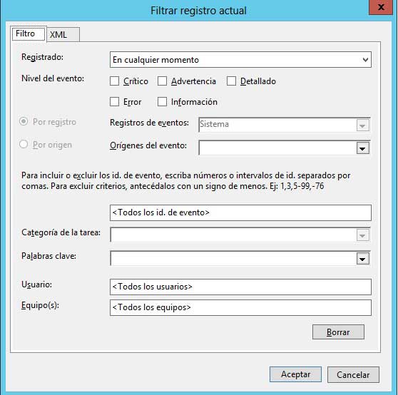 Dentro del visor de eventos podemos filtrar según los requerimientos que tengamos: