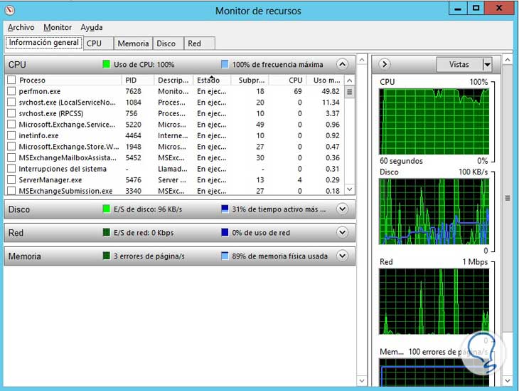 El monitor de recursos nos brinda información detallada acerca de los recursos del sistema, CPU, memoria, discos duros y red. Esta herramienta nos permite analizar que procesos o servicios están consumiendo de manera anormal alguno de los recursos de hardware del servidor, lo cual puede incidir en un bajo rendimiento en la máquina.