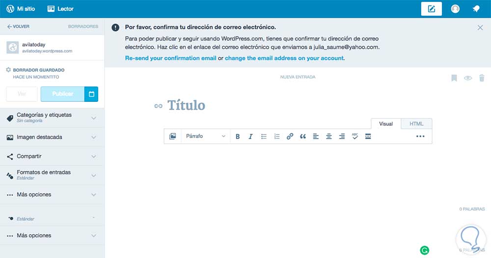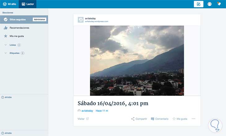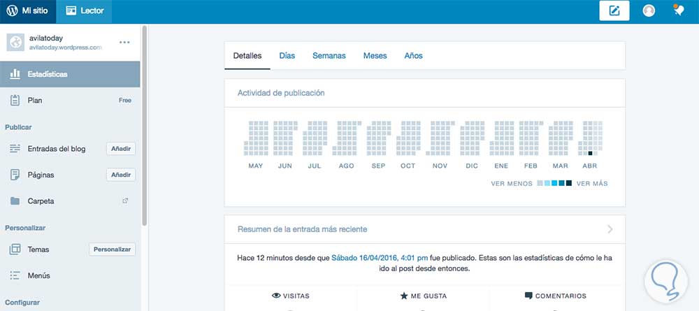 Al hacer clic en “Mi sitio” podrás ver tus estadísticas y detalles de tu blog, así como hacer cambios y editarlo, y siempre en el icono de lápiz en la parte superior derecha podrás realizar nuevas publicaciones