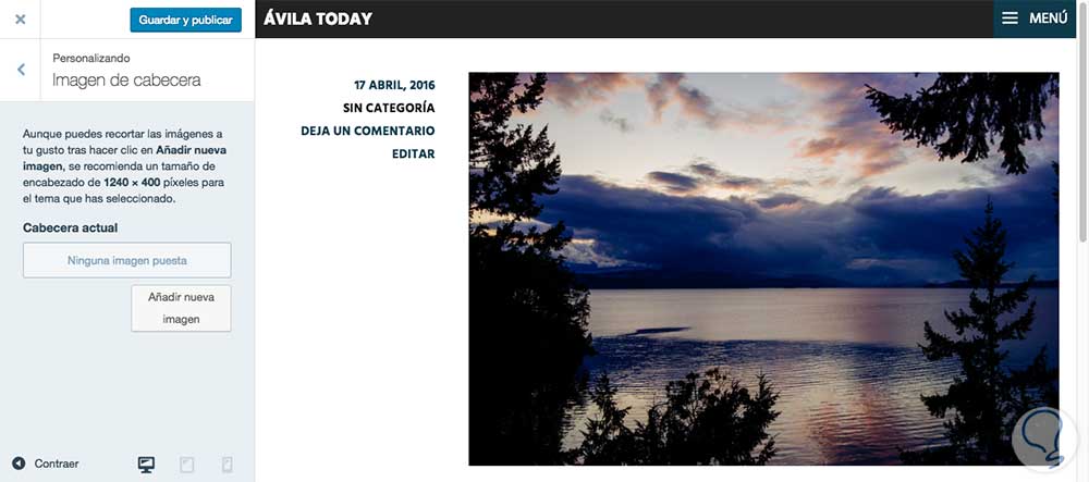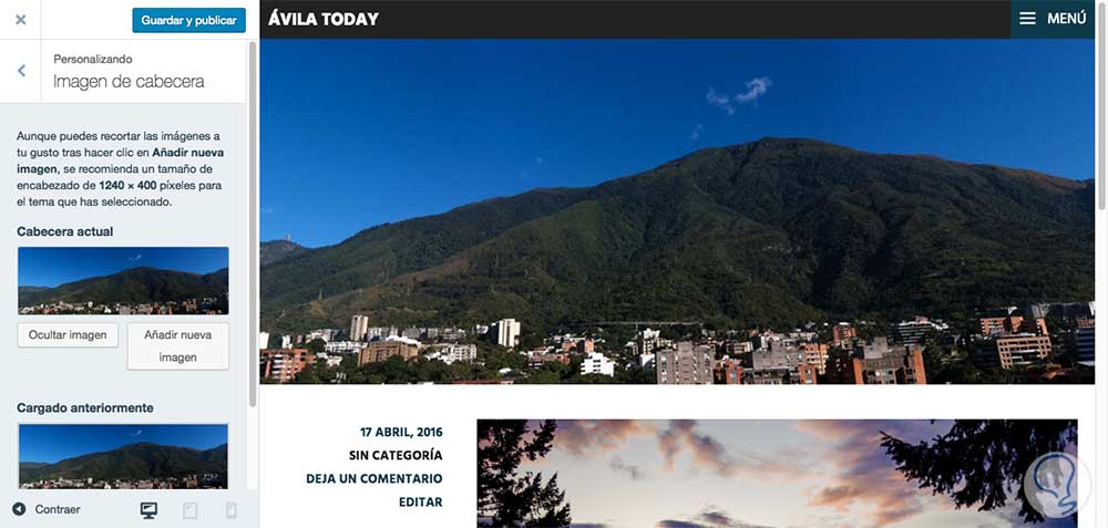 Una vez hagas eso, del lado derecho de la pantalla verás una previsualización de cómo está quedando tu blog con esa imagen de cabecera. Puedes dejarla, cambiarla haciendo clic en “Añadir nueva imagen” o eliminarla haciendo clic en “Ocultar imagen”.
