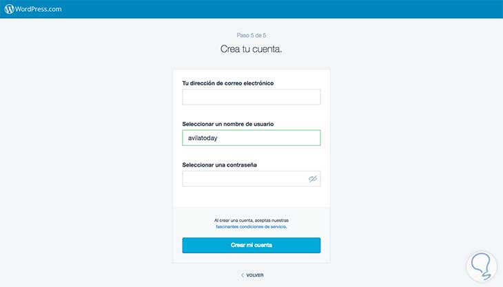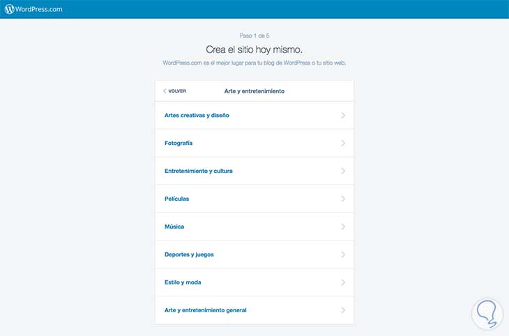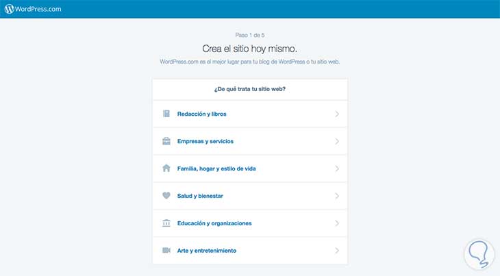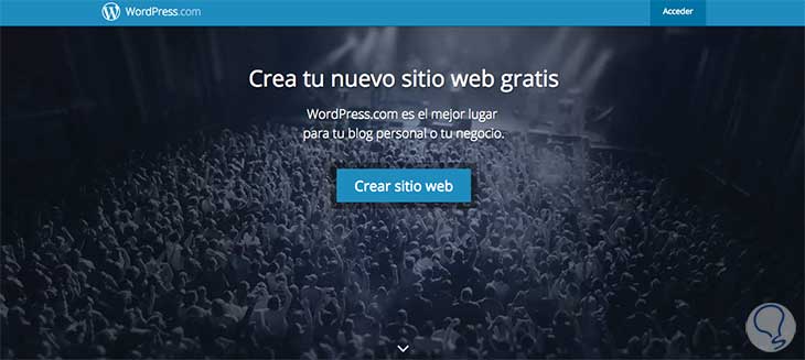 Dirígete a la página oficial de Wordpress y haz clic sobre “Crear sitio web”
