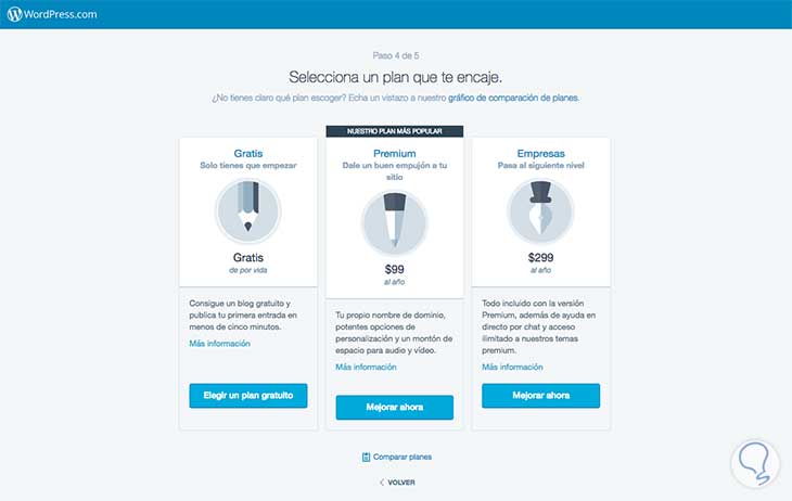 En el siguiente paso tendrás que escoger qué plan prefieres. Como verás, cada uno tiene sus beneficios, pero aquí escogeremos la versión gratuita que ofrece opciones de personalización y plug-ins mucho más limitadas. Sin embargo, ten en cuenta que siempre podrás hacer upgrades a esos planes pagos, o comprar otras plantillas que sean pagas
