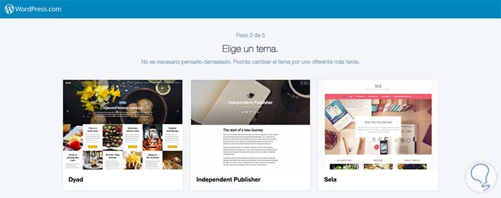 Todas estas preguntas sirven para el siguiente paso, ya que dependiendo del tema general que has escogido, WordPress te mostrará una pre-selección de plantillas que considera más idóneas para el blog que estás creando. No te preocupes demasiado si escoges una plantilla que no te convence, ya que más adelante la podrás cambiar sin problemas.