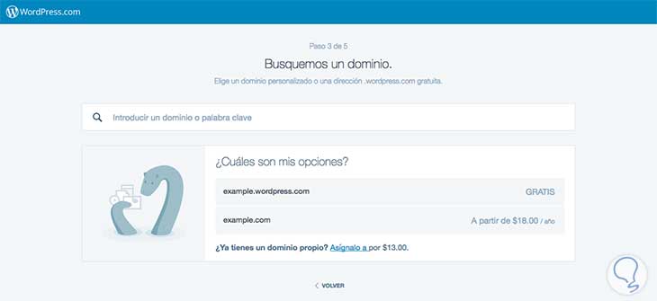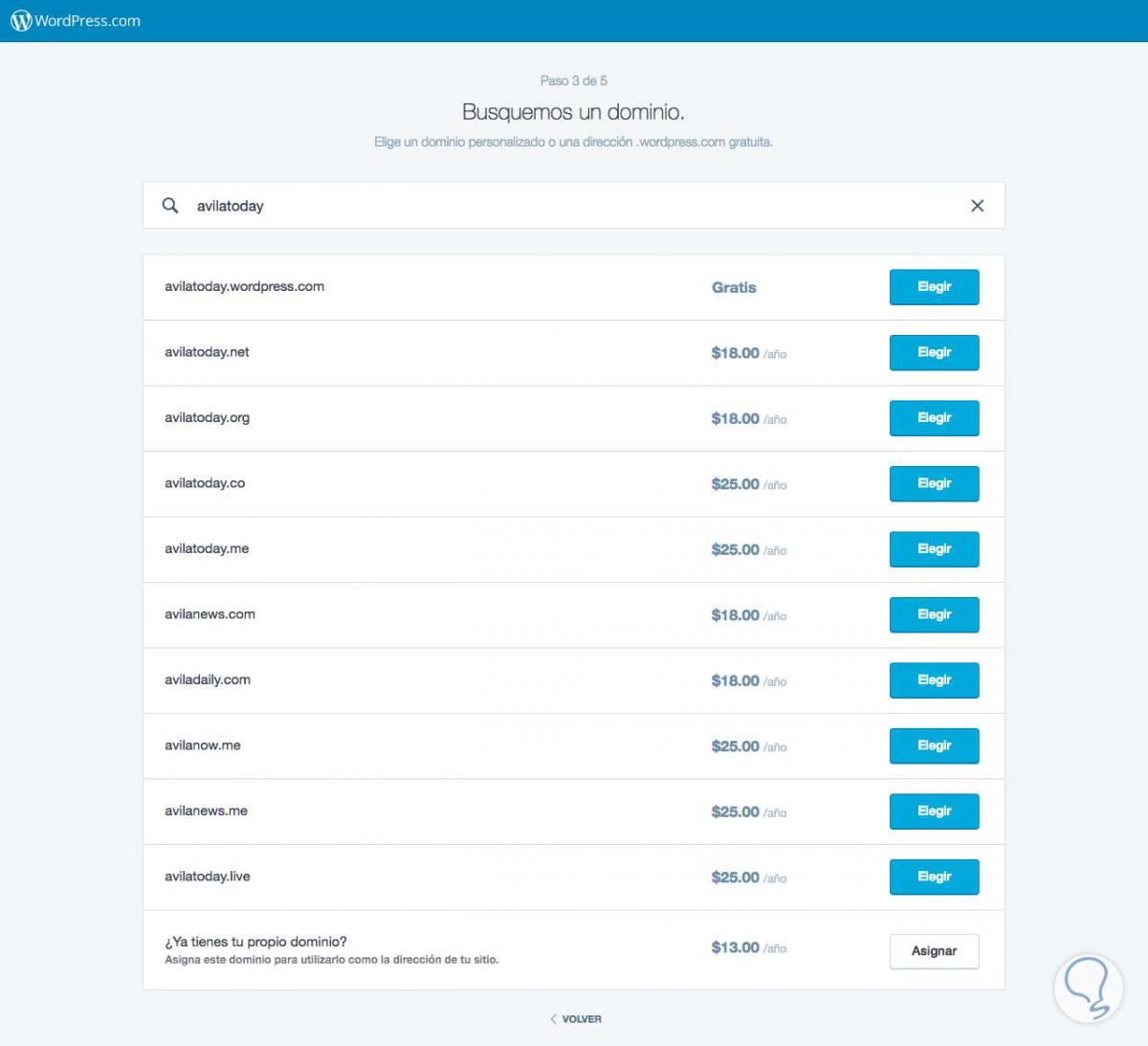 Cuando lo escribas, se te presentarán varias opciones. Una gratuita con la coletilla de .wordpress.com y otras con precio si es que ya deseas comprar tu propio dominio. En este ejemplo escogeremos la opción gratis.