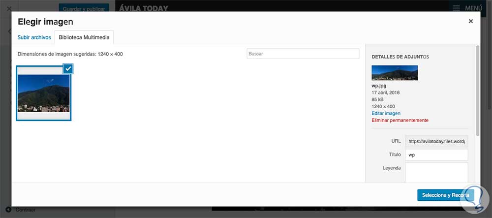 Como la imagen que subí ya tiene las dimensiones sugeridas por WordPress, selecciono “Saltar el recorte de la imagen”