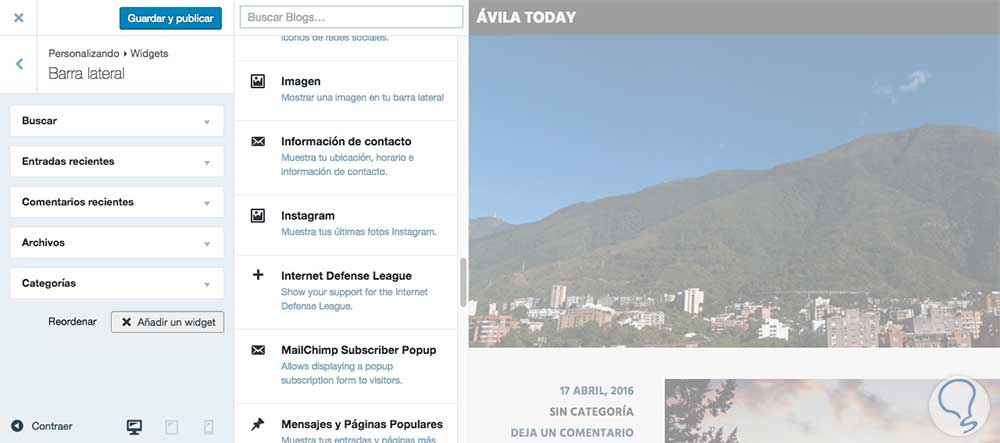 En “Widgets” puedes escoger qué cosas agregar a tu barra lateral. Ya WordPress tendrá unas opciones pre-cargadas, pero puedes eliminarlas o agregar otras nuevas haciendo clic en “Añadir un widget
