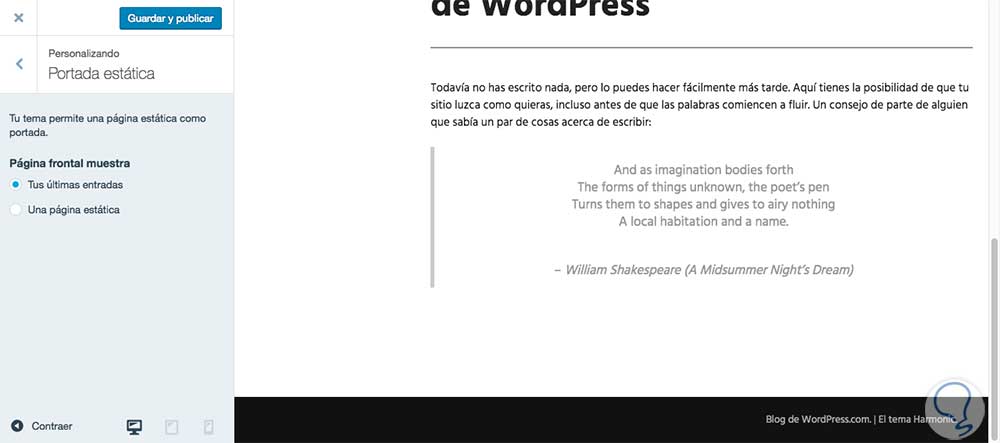 En “Portada estática” puedes escoger si la gente al entrar en tu página principal ve tus publicaciones más recientes, o si ven un contenido estático que tú decidas