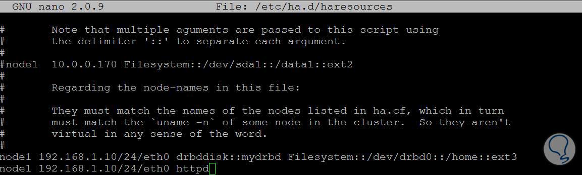 Para finalizar la configuración, debemos editar el archivo haresources con el comando: