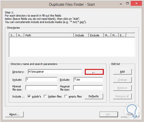 En las barras de Minimal file size y Maximal file size podremos gestionar la cantidad de archivos que queramos comparar y así no nos llevará todo tanto tiempo estar buscando datos duplicados en nuestro disco duro o alguna otra carpeta ordinaria. Después de esto tenemos tres casillas que podremos seleccionar, subdir’s, hidden files y empty files; la primera funciona básicamente para agregar subdirectorios a la búsqueda. Hidden files nos permite buscar archivos que de alguna u otra manera tengamos ocultos y la última casilla nos permite encontrar datos duplicados que estén vacíos, pero que de igual forma generan basura digital.