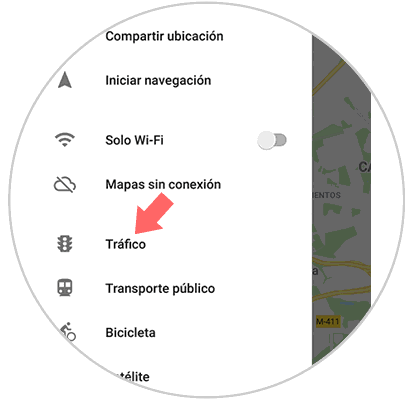 Una vez tengamos esto, ya podemos establecer nuestra ruta. A continuación debemos desplegar el menú situado en la esquina derecha y pulsar en “Tráfico”.