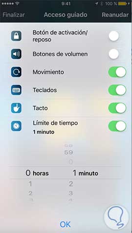 Este limite de tiempo podemos activarlo desde un minuto hasta 23 horas y 59 segundos. Una vez aceptemos, quedaría activado. Si finalmente queremos desactivarlo antes de tiempo, tendríamos que utilizar o bien el código seleccionado o bien el Touch ID.