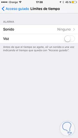 Otro de los puntos que debemos configurar es el limite de tiempo. Aquí podemos seleccionar si queremos que antes de que el tiempo se agote, nuestro teléfono emita un sonido o una voz indicando el tiempo que queda.