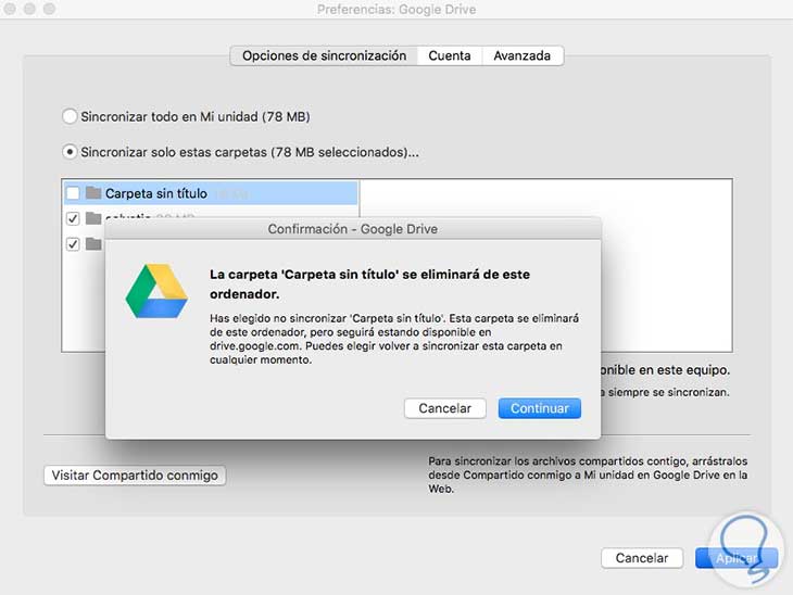 Debemos hacer clic en las casillas de verificación junto a las carpetas que no queremos sincronizar, para asegurarnos de que no hay chek azul.