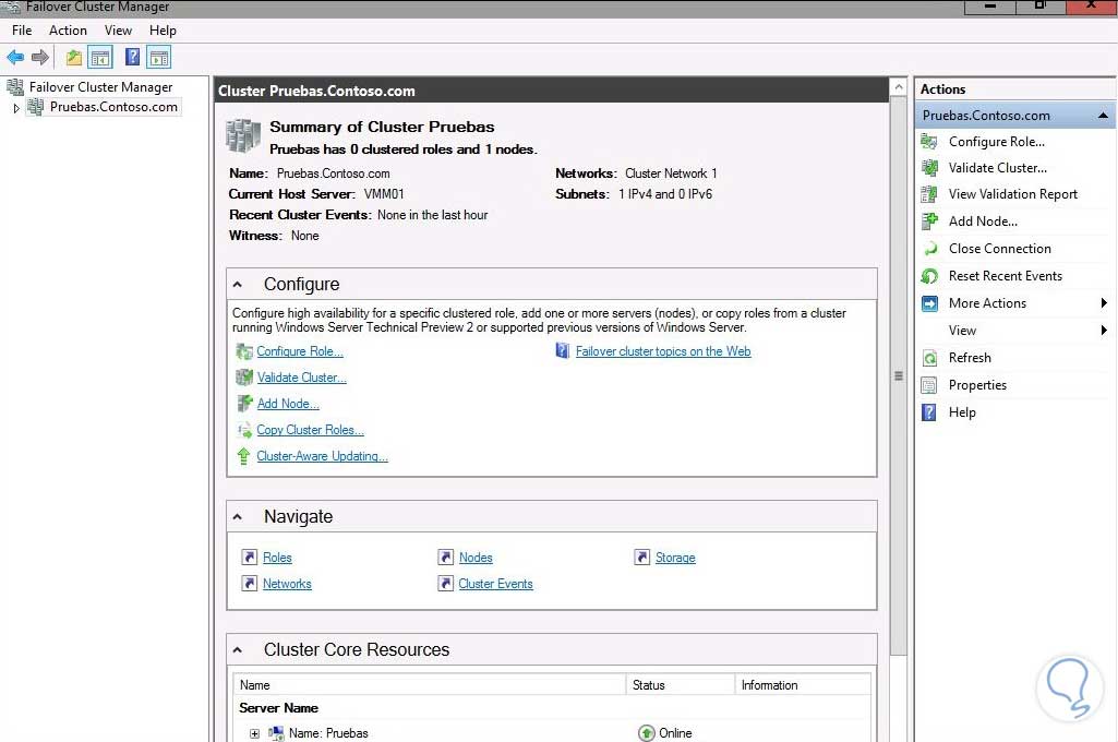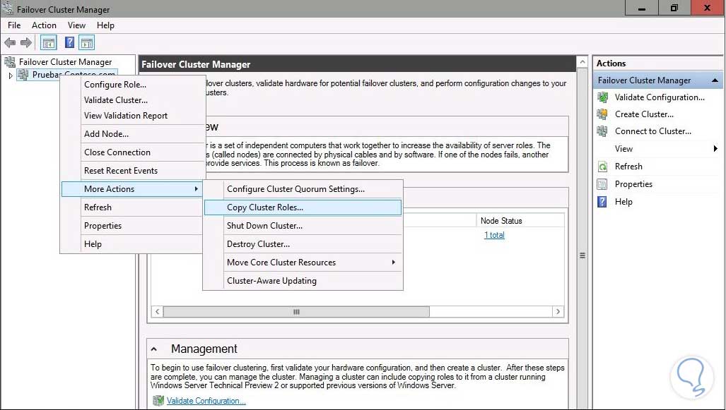 2) Se desplegará la ventana del respectivo menú, allí daremos clic derecho en nuestro dominio y seleccionamos la opción More Actions o Más Acciones y seleccionamos la opción Configure Cluster Quorum Settings.