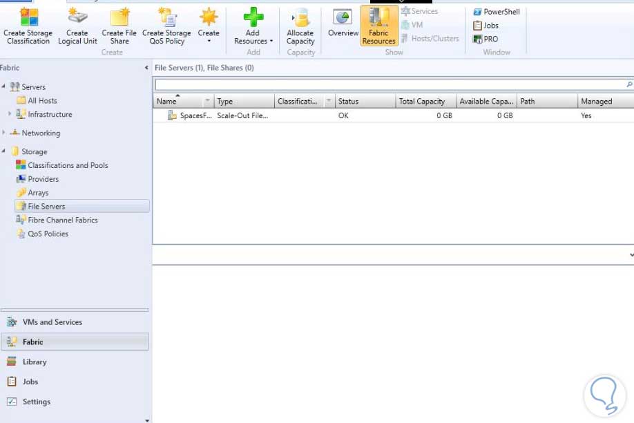 Para revisar el cluster creado iremos a la opción File Servers ubicado en la ficha Storage en el costado izquierdo. Allí podremos ver información relacionada archivos compartidos, disponibilidad, etc.
