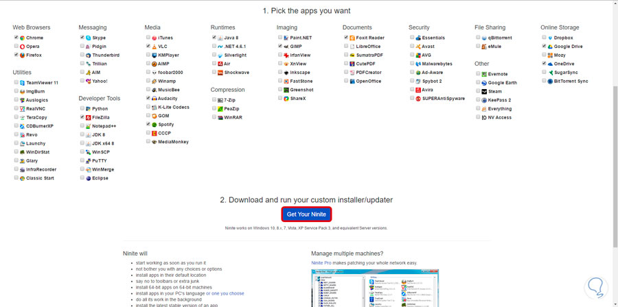 Ahora tendrás que configurar tu propio instalador. Para ello selecciona aquellas aplicaciones que quieres que se instalen en tu ordenador, márcalas y después dale a Get your Ninite.