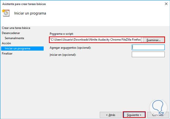 Tras haber definido la acción, debemos establecer qué programa va a abrirse, en este caso Ninite. Para ello debemos localizar el programa, es decir, nuestro instalador. Una vez lo has ubicado en el botón de Examinar, dale a Siguiente.
