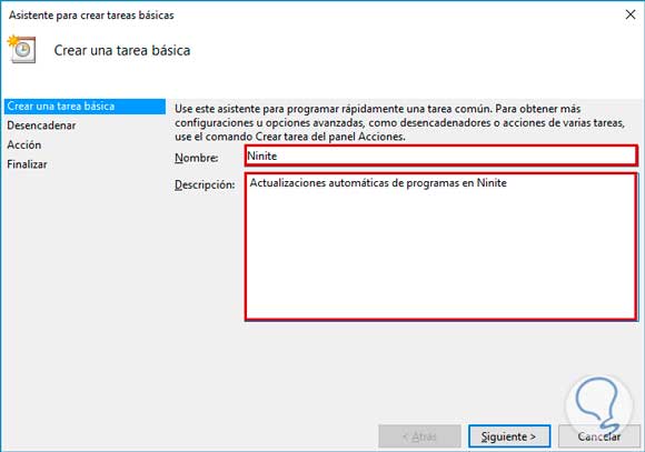 En la siguiente ventana ya te aparecerán las opciones para configurar la tarea automática. Escribe un nombre y una descripción breve para esta tarea