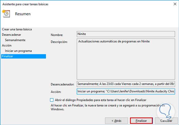 En esta última ventana verás el resumen de tu tarea creada para Ninite según la configuración establecida. Sólo tendrás que dar a Finalizar para que los cambios tengan efecto.