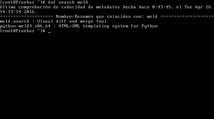 Así mismo podemos realizar una búsqueda por texto, es decir, buscar los paquetes que contengan ciertas palabras, por ejemplo buscaremos todos los paquetes que incluyen el término meld (dnf search meld).