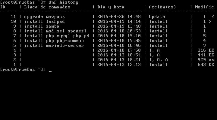 dnf historyVeremos que cada evento tiene un ID, el comando ejecutado, la fecha y hora y la acción tomada.