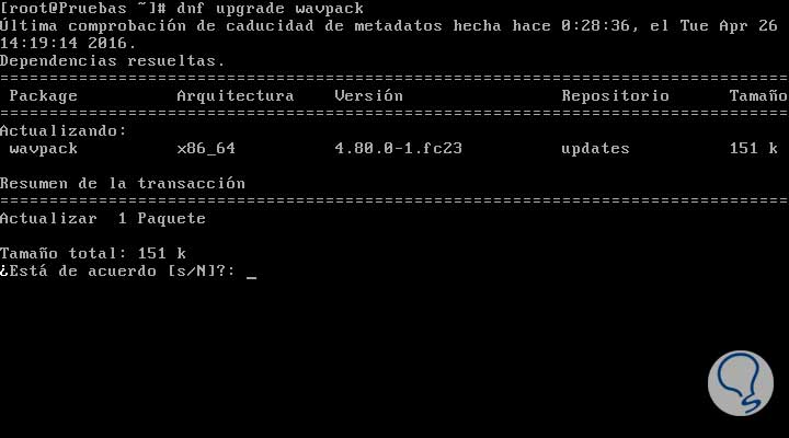 Aceptamos la descarga y posterior instalación. Con DNF podremos descargar, instalar o actualizar paquetes completos o librerías.