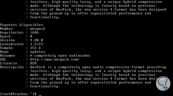 dnf repository-packages repo_id list, por ejemplo, dnf repository-packages updates listDentro de las muchas funciones podemos ejecutar el comando dnf info package_name¸ para poder observar toda la información de un paquete, por ejemplo, podemos observar la información del paquete wavpack, ingresaremos el comando: