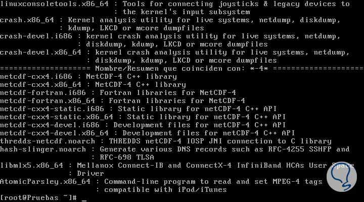 Por ejemplo buscaremos los paquetes que incluyan el número 4 en su versión o en alguna parte de la misma, para ello ejecutaremos el comando: