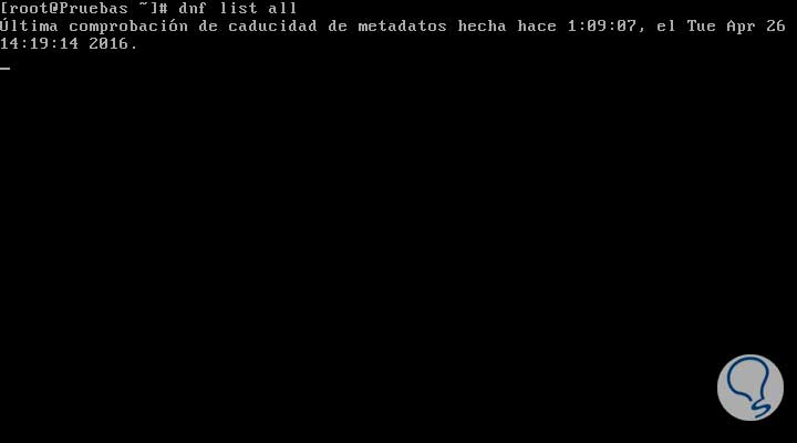 dnf listCon este comando podemos desplegar información sobre los paquetes, grupos de paquetes o, si lo deseamos, sobre los repositorios.
