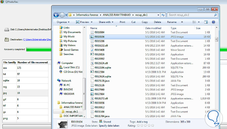 Podemos ver las extensiones de los archivos recuperados de la unidad virtual que creamos, este directorio recuperado es físico, no es virtual o lógico, así que tendremos los archivos a nuestra disposición en forma permanente. Este software también ha recuperado archivos exe, por lo que podríamos analizarlos para ver si alguno es un virus o un software peligroso para el sistema, por ello es mejor ejecutar este tipo de análisis en una maquina virtual como VirtualBox.