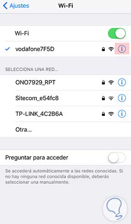 Ahora que ya estamos dentro de las redes Wifi que nuestro teléfono guarda, tenemos que seleccionar el icono de una i dentro de un circulo de aquella red que queramos olvidar, para acceder a su configuración.
