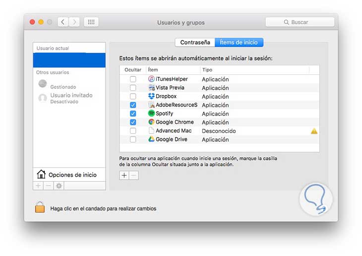 Lo primero de todo es acceder a las “Preferencias del sistema” que las podemos encontrar en el menú de inicio de Apple. Aquí tenemos que acceder a “Usuarios y grupos” Dentro de este apartado, debemos seleccionar la pestaña de “Ítems de inicio” para poder comprobar cuáles son estos programas