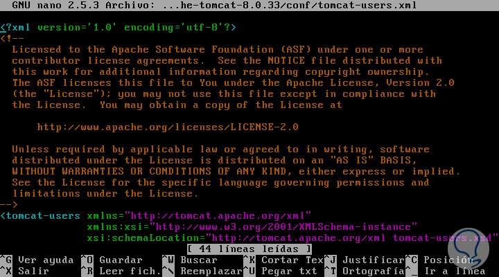 sudo nano /var/local/apache-tomcat-8.0.33/conf/tomcat-users.xmlSe desplegará la siguiente información: