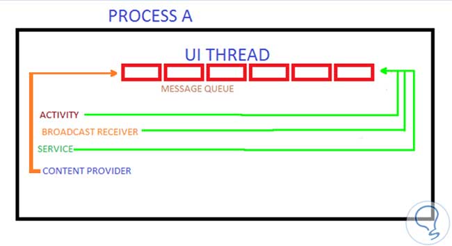 El PROCESO A posee un UI o MAIN thread, este thread maneja un message queue o cola de mensajes, el cual se va ejecutando a medida que el thread se va desocupando, ¿quién maneja esto? El Looper.