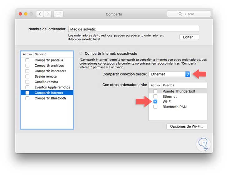 En el caso de que nuestro Mac se conecte a internet a través de un adaptador Ethernet, deberos elegir esa opción en la lista de la parte superior derecha de la ventana y compartir esa conexión por cable a través de Wi Fi.
