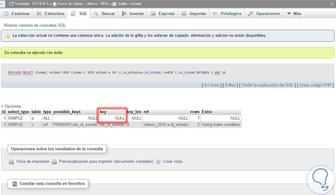 Selecciona una consulta SELECT (preferiblemente una compleja, con uniones), y añade la palabra EXPLAIN al principio de todo. Te devolverá los resultados en una sencilla tabla. Por ejemplo, supongamos que me he olvidado de poner un índice a una columna, nos mostraría la siguiente pantalla: