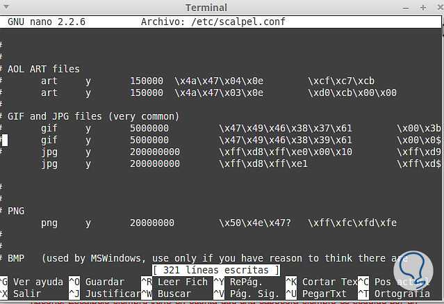 A continuación abrimos el archivo con algún editor de texto como nano o vi. Por defecto, todas las líneas de las expresiones se comentan con # en el archivo de configuración. En el archivo de configuración scalpel.conf, hay algunas líneas que contienen los tipos de archivos que podemos recuperar. Por ejemplo jpg, png, doc, etc.