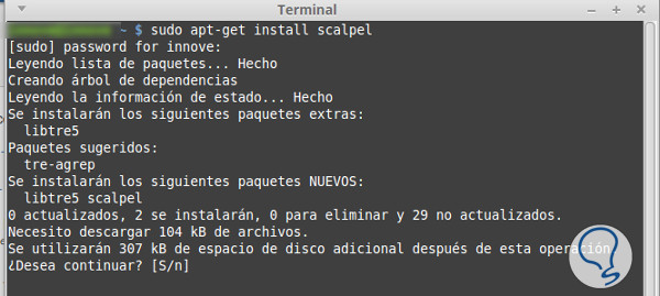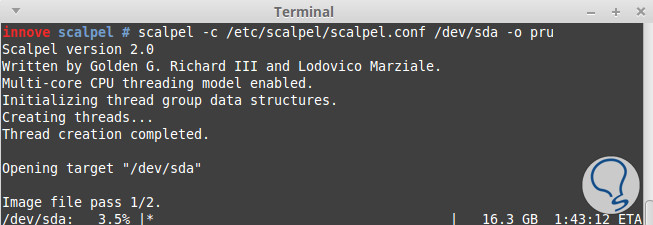 A continuación ejecutamos scalpel desde su carpeta, indicamos la carpeta donde se guardan los archivos recuperados.