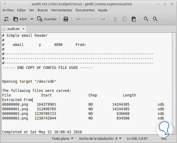 Dentro de la carpeta se guarda en archivo denominado audit.txt que contiene información de todo el proceso y los archivos recuperados.